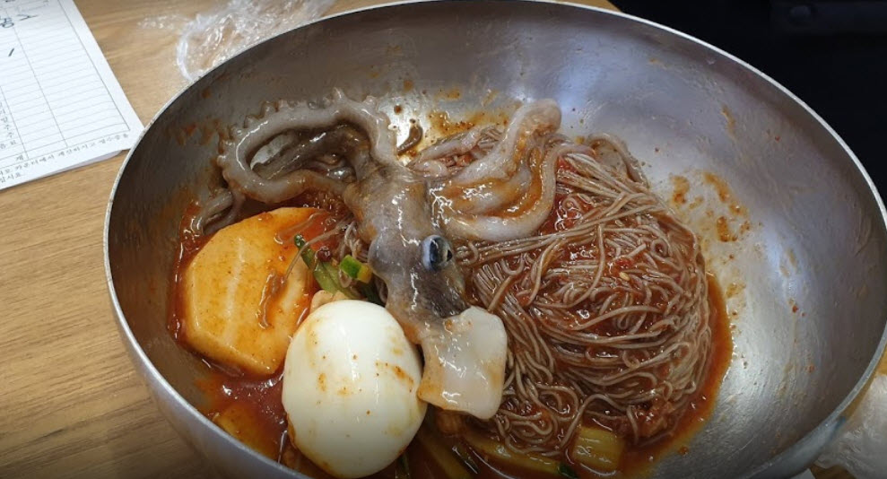 “이집은 돼지고기 수육을 무침으로 주는 목포에서 맛볼 수 있는 별미와 산낙지 한 마리를 통째로 올려서 주는 세발낙지회냉면이 인기가 좋다고 한다. 스스로 말하기로는 ‘매콤한 냉면 위에 산 낙지 한 마리가 통째로 올려 나오는 곳. 이 집의 대표 메뉴는 일반적인 함흥냉면에 고명으로 산 낙지를 얹어 나오는 집입니다. 냉면의 면발이 쫄깃하며 양념 또한 새콤달콤 하다는 평을 받습니다. 신선한 산 낙지가 그릇 안에서 꿈틀거립니다. 낙지 냉면과 더불어 수육무침과 함께 나오는 냉면도 인기가 높습니다.’라고 말할 정도로 제대로 된 식당이라 합니다.”